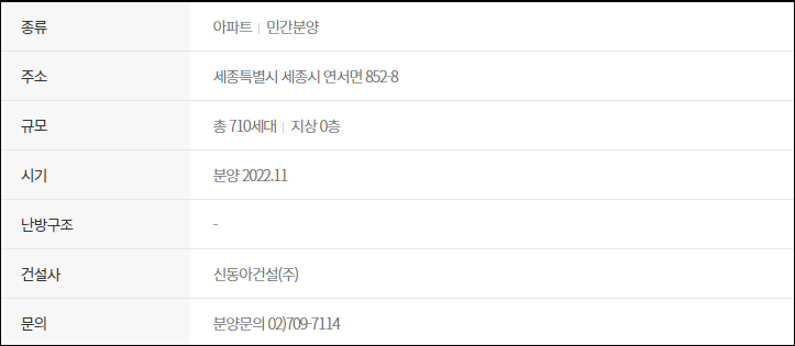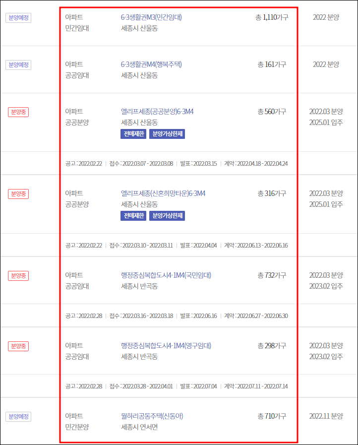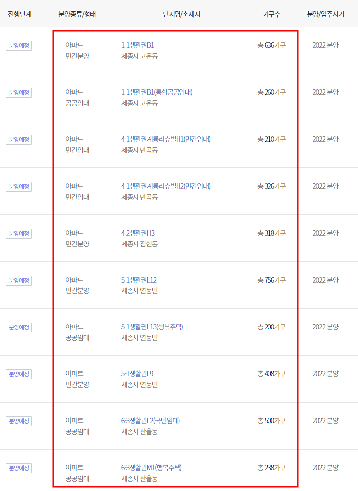 22년 세종특별자치시 아파트 분양 일정 계획 목록
